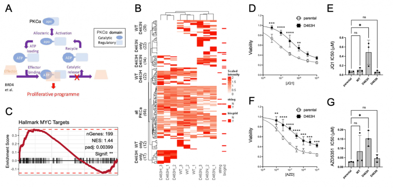 Figure 1: Model of PKCα-D463H gain-of-function mechanism and preliminary data. A. D463H mutation locks PKCα in an ATP bound state to drive allosteric effector activation. B. The D463H mutation has a distinct protein interactome to both WT-PKCα and the non-ATP binding D463N mutant. C. D463H drives activation of Myc target genes and (D-E) decreases glioma cell sensitivity to BET inhibitors.